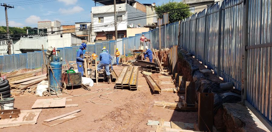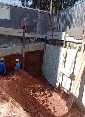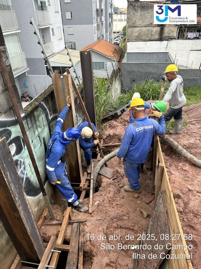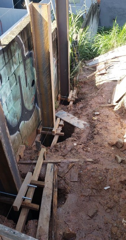 | - Foto em 15/04/2025 - Implantação de perfis metálicos nos tubuões (fustes) da contenção da esquina. | |